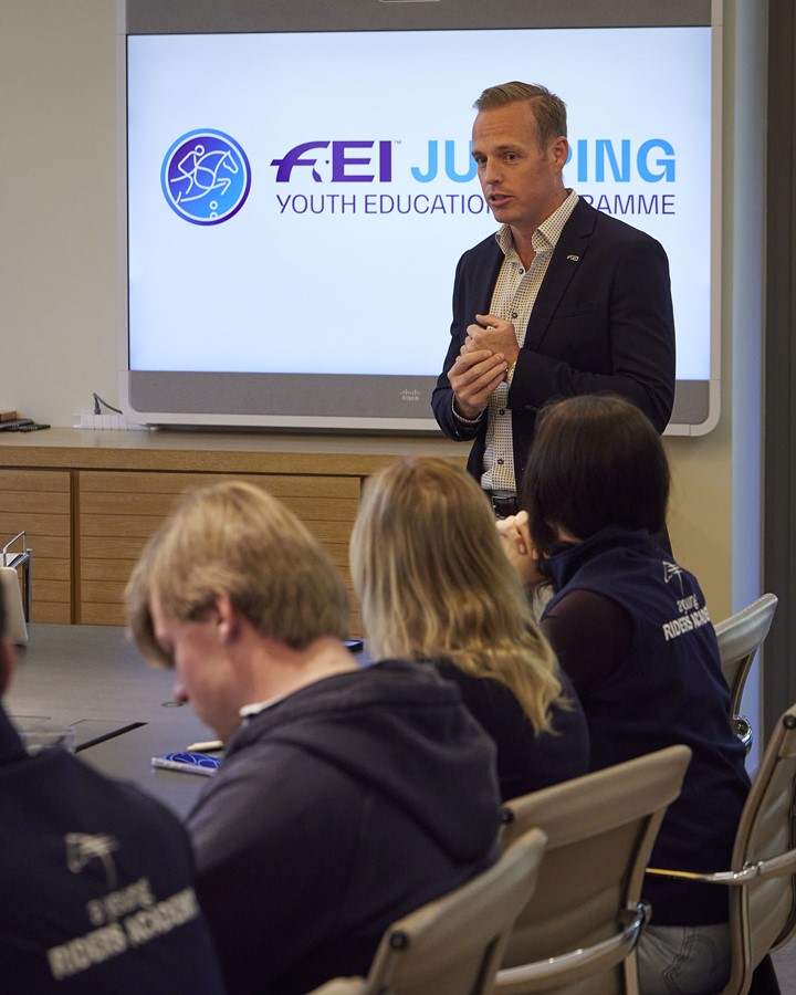 The riders also visited the FEI Headquarters, where they met with members of the FEI Jumping Department. During the visit, they followed presentations exploring regulatory frameworks, governance and the institutional structure that supports international equestrian competition.